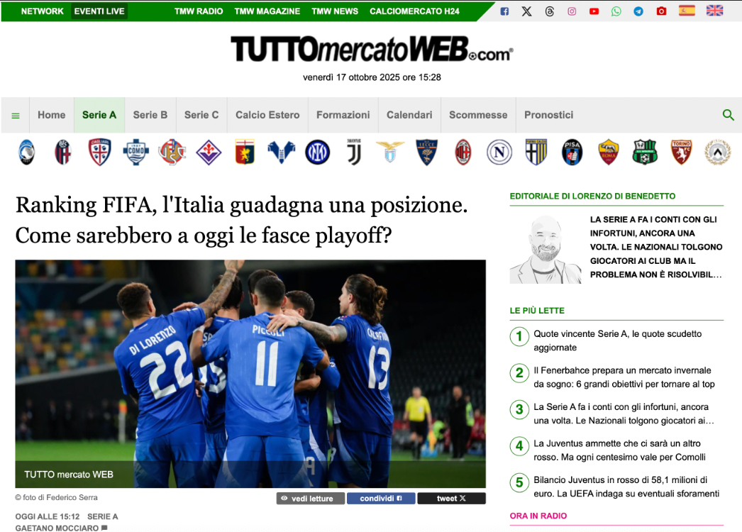 In this section, you'll find a selection of online articles and press publications that have featured my photographs. From professional football to sports coverage for both local and national media, each screenshot is a tangible proof of my work's presence across the web. Collaborations include outlets such as SkySport, TuttoSport, SportMediaset, La RePubblica, TuttoMercatoWeb.com, local news sites, and national sporting event coverage.